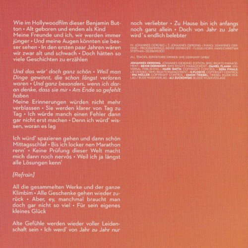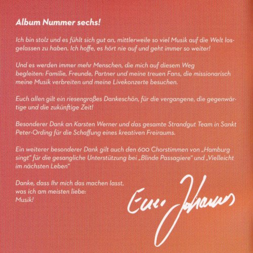 Und es werden immer mehr Menschen, die mich auf diesem Weg begleiten: Familie, Freunde, Partner und meine treuen Fans, die missionarisch meine Musik verbreiten und meine Livekonzerte besuchen. Euch allen gilt ein riesengroßes Dankeschön, für die vergangene, die gegenwärtige und die zukünftige Zeit! Besonderer Dank an Karsten Werner und das gesamte Strandgut Team in Sankt Peter-Ording für die Schaffung eines kreativen Freiraums. Ein weiterer besonderer Dank gilt auch den 600 Chorstimmen von „Hamburg singt“ für die gesangliche Unterstützung bei „Blinde Passagiere“ und „Vielleicht im nächsten Leben“