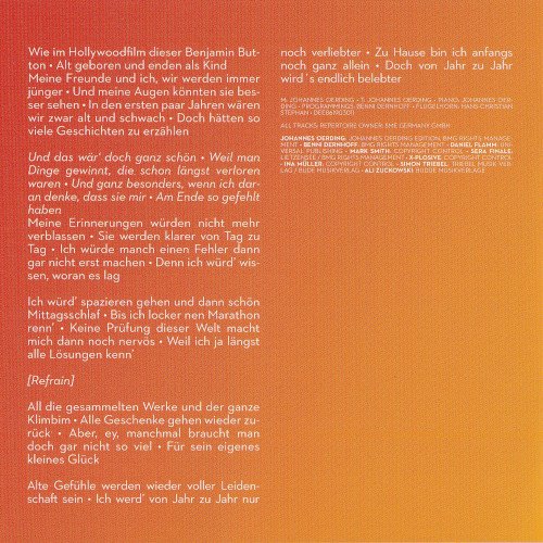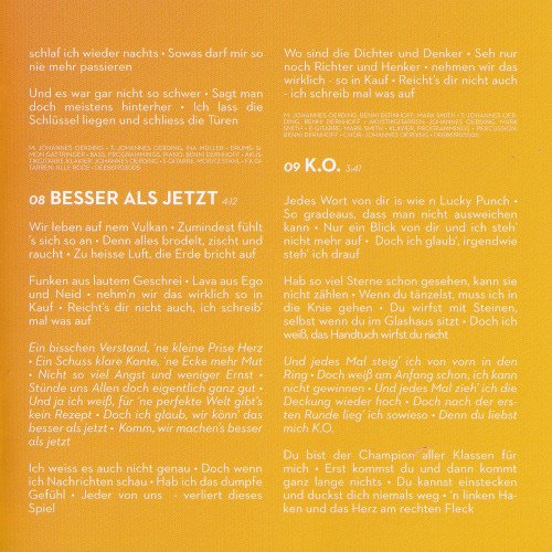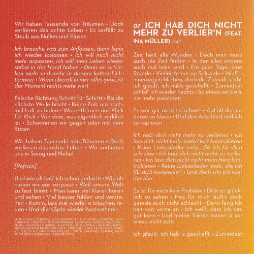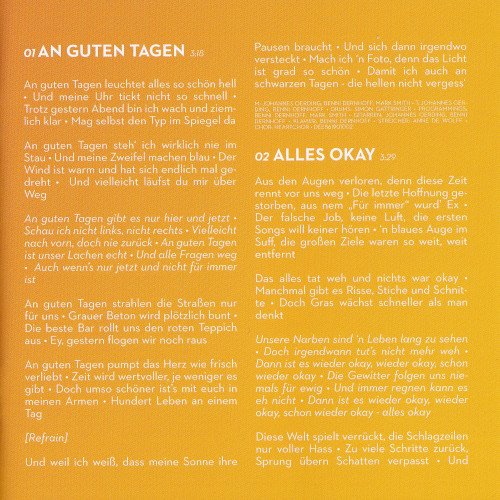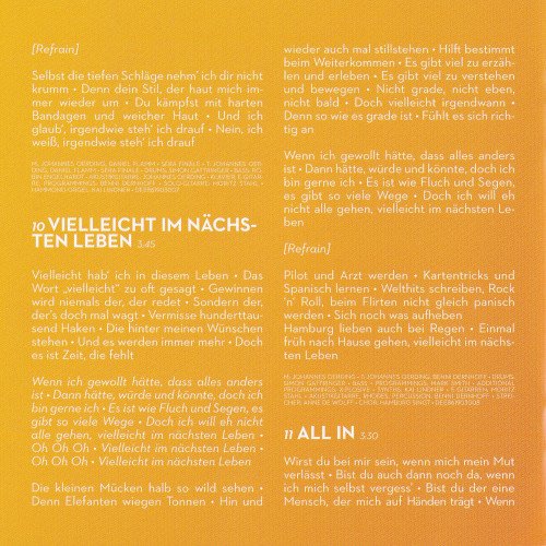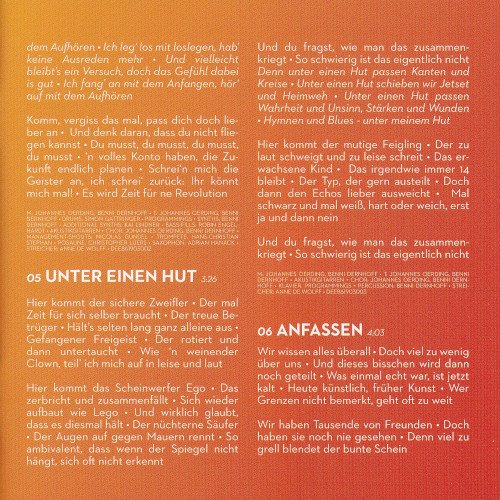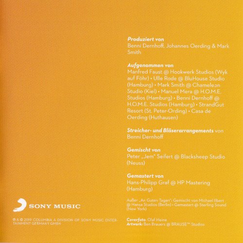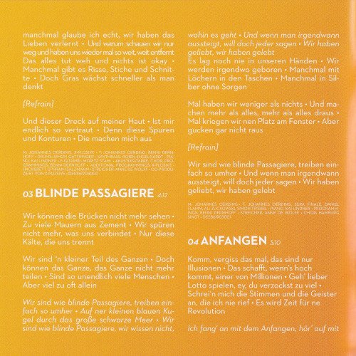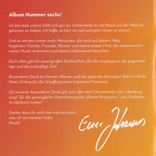 Und es werden immer mehr Menschen, die mich auf diesem Weg begleiten: Familie, Freunde, Partner und meine treuen Fans, die missionarisch meine Musik verbreiten und meine Livekonzerte besuchen. Euch allen gilt ein riesengroßes Dankeschön, für die vergangene, die gegenwärtige und die zukünftige Zeit! Besonderer Dank an Karsten Werner und das gesamte Strandgut Team in Sankt Peter-Ording für die Schaffung eines kreativen Freiraums. Ein weiterer besonderer Dank gilt auch den 600 Chorstimmen von „Hamburg singt“ für die gesangliche Unterstützung bei „Blinde Passagiere“ und „Vielleicht im nächsten Leben“